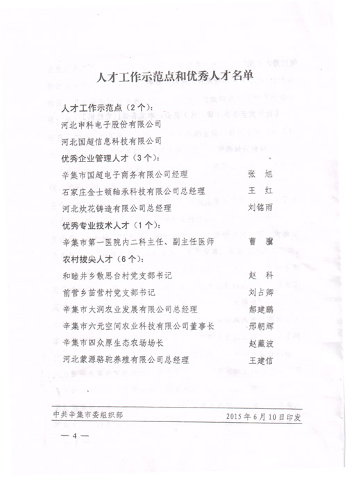 2015年6月10日,我公司被中共辛集市委組織部確定為“人才工作示范點(diǎn)”,公司子公司----辛集市國(guó)超電子商務(wù)有限公司總經(jīng)理張旭被評(píng)為“優(yōu)秀企業(yè)管理人才”。