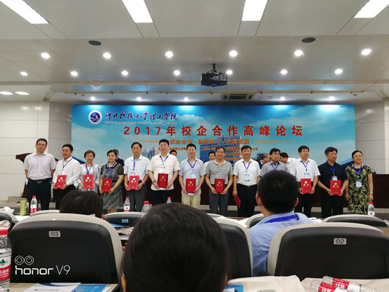 | 河北科技大學(xué)理工學(xué)院成立于2001年,是經(jīng)河北省人民政府批準(zhǔn)、教育部首批確認(rèn),由河北科技大學(xué)舉辦的全日制本科層次獨(dú)立學(xué)院,是河北省首批應(yīng)用轉(zhuǎn)型發(fā)展試點(diǎn)高校。 2017年6月2日在河北科技大學(xué)學(xué)術(shù)報告廳召開了以“校企合作、協(xié)同育人、共謀發(fā)展”為主題的校企合作高峰論壇會議。 會上我公司被河北科技大學(xué)理工學(xué)院確定為“校企聯(lián)合培養(yǎng)實踐基地”,并授牌,會上我公司董事長劉占查和編譯部主任強(qiáng)紅心還被聘請為“校企聯(lián)合培養(yǎng)指導(dǎo)老師”,并頒發(fā)了聘書。