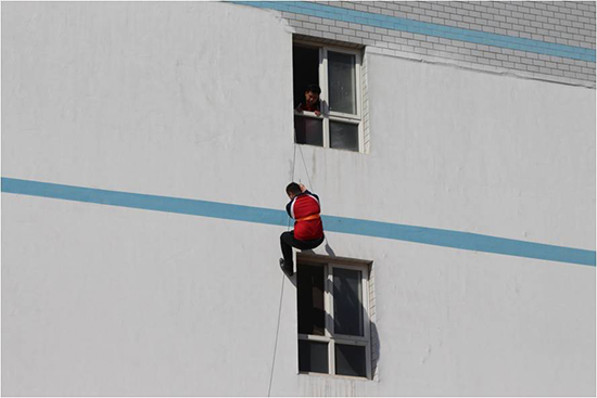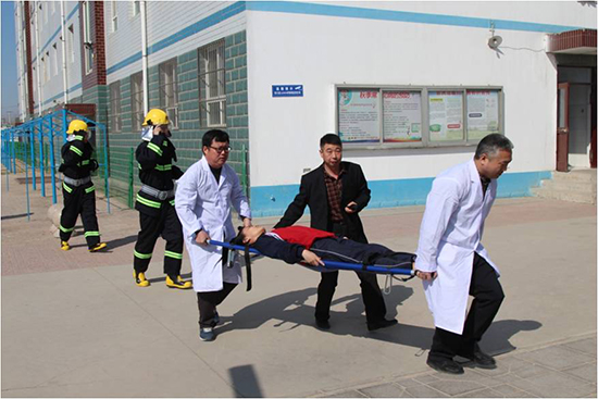 本次活動(dòng)假想新壘頭鎮(zhèn)中學(xué)學(xué)生宿舍樓三樓因線路設(shè)備老化發(fā)生火災(zāi),學(xué)生發(fā)現(xiàn)火情,迅速報(bào)告值班老師,值班老師到現(xiàn)場(chǎng)查看后通知值班室,然后迅速啟動(dòng)消防應(yīng)急預(yù)案,組織學(xué)生進(jìn)行緊急疏散。失火點(diǎn)位于三樓宿舍內(nèi),值班人員率先組織三樓學(xué)生進(jìn)行疏散,之后四樓值班人員聽(tīng)到廣播開(kāi)始組織學(xué)生疏散,五樓、二樓、一樓的學(xué)生在老師組織下依次有序疏散。經(jīng)過(guò)3分25秒,全校1100多名師生有序疏散完畢,趕到指定地點(diǎn)集合。 學(xué)校消防員接到火災(zāi)通知后迅速穿戴消防戰(zhàn)斗服及防煙面具,攜帶滅火器沖入火場(chǎng),處理初期火災(zāi)。因火勢(shì)太大,無(wú)法控制,通訊組匯報(bào)給校長(zhǎng),馮校長(zhǎng)立刻撥打了119火災(zāi)報(bào)警電話。得知一名同學(xué)昏迷,學(xué)校醫(yī)護(hù)人員迅速趕到宿舍樓,用擔(dān)架抬出昏迷學(xué)生,120急救人員立即進(jìn)行搶救。消防人員指導(dǎo)四樓被困學(xué)生用緩降器進(jìn)行自救,并派遣云梯車對(duì)樓頂學(xué)生進(jìn)行營(yíng)救。